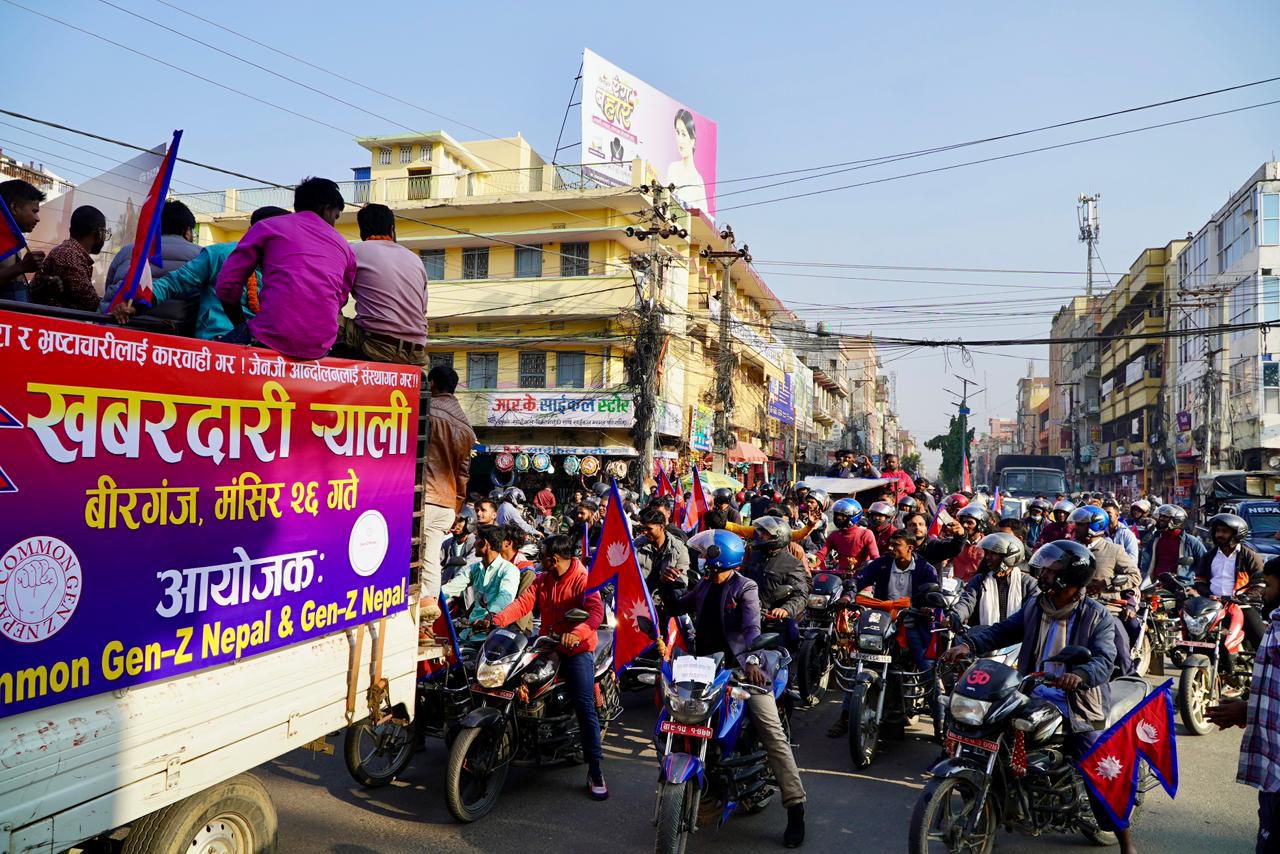 जेनजी हत्यारा, भ्रष्टाचारीलाई कारबाहीको माग गर्दै वीरगंजमा खबरदारी मोटरसाईकल र्याली