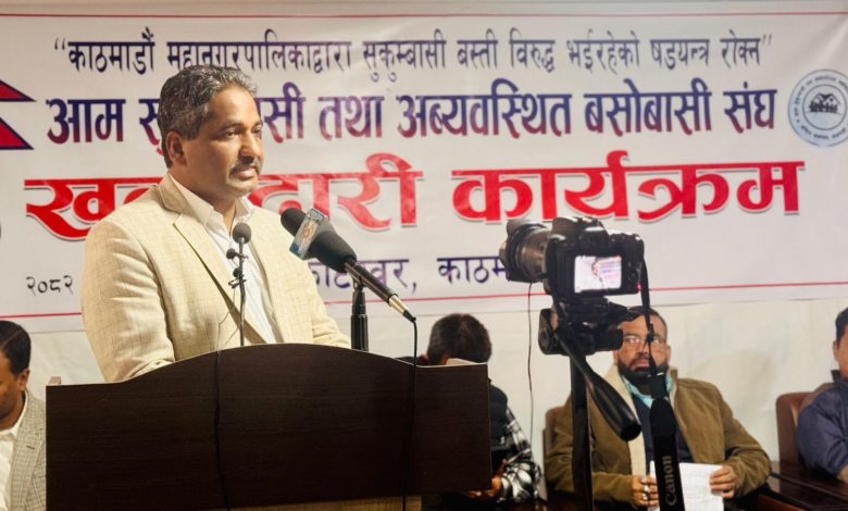 ‘सुकुम्बासीलाई हटाउने होईन, बसिरहेकै क्षेत्रमा पक्की घर बनाएर सरकारले दिनुपर्छ । संविधान, कानूनले सबै नेपालीको बस्ने, खाने, रोजगारी गर्ने अधिकार दिएको छ । यदी कानून विपरित काठमाडौं महानगरले सुकुम्बासी बस्तीमा डोजर आतंक मचाएर उपद्रो मचाउन खोजे त्यो आफूहरुलाई कुनै हालतमा स्वीकार्य हुदैन,’ आजपा अध्यक्ष साहले भने, ‘गरिब हटाउने होइन, गरिबी हटाउने सदबुद्धी मेयर बालेनलाई आओस । सुकुम्बासीलाई आतंकित बनाउने कार्य बन्द गर्नुस् । त्यो हामीलाई कुनै हालतमा पनि स्वीकार्य छैन् ।’
