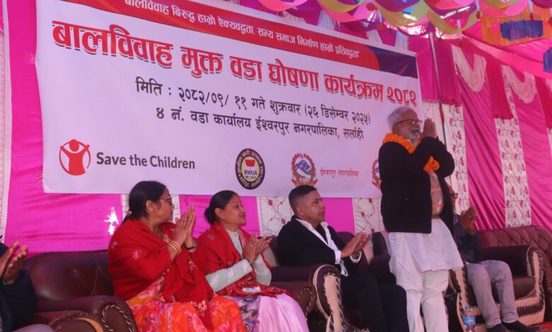 सर्लाही । ईश्वरपुर नगरपालिका वडा नं. ४ लाई औपचारिक रूपमा बालविवाह मुक्त वडा घोषणा गरिएको छ । बालविवाह अन्त्यका लागि सञ्चालन गरिएको अभियान अन्तर्गत आवश्यक सबै प्रक्रिया र सूचकहरू पूरा भएपछि वडालाई बालविवाह मुक्त घोषणा गरिएको हो ।